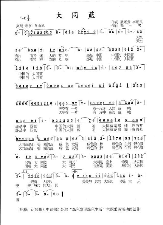“如何以更通俗化的方式将‘大同蓝’宣扬出去,让更多的人看到大同的绿色发展和美丽生态?”李朝民想到了歌曲。于是,他主动邀请山西省文联副主席、一级作家聂还贵共同作词,大同大学音乐学院教授孙一鸣作曲,共同为“大同蓝”谱写了一曲颂歌,并借此传播“绿色发展绿色生活”的理念。