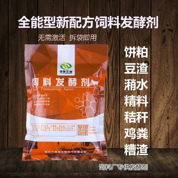 产品名称:饲料发酵剂 饲料发酵剂含芽孢杆菌、乳酸菌、酵母菌、丝状真菌等多种功能型微生物菌群,能快速提高饲料转化率,分解粗纤维,提高适口性,具有无需激活直接使用的优点。 【产品功效】 1、降低饲养成本 发酵后的能量饲料转化成菌体蛋白饲料,用该发酵物料配制全价料,可减少50%左右的蛋白质饲料从而降低饲养总成本。 2、提高饲料适口性 经本品发酵后的产物呈金黄色泽,手感滑爽,气味清香,口感极佳,很适合生喂,动物喜吃而且多吃,大大节省燃料及人工成本。 3、使饲料除毒脱毒 依靠益生菌自身生命活动及其代谢产物,使饲料内所含有毒、有害物质被降解而脱除,提高饲料的安全性。 4、提高饲料利用率 将纤维素、果胶质等难以降解的“大分子”物质转化为单糖和寡糖等“小分子”物质,并生成多种有机酸、微生素、生物酶、氨基酸及其他多种未知生长因子,提高了所发酵物料的营养水平和消化利用率 【适用范围】 适用于玉米粉、麦麸、糠、糟渣(苹果渣、醋渣、啤酒渣、红薯渣、豆渣等)、秸秆、稻草、棉菜粕、豆粕、禽粪(鸡粪、鸽粪等)、潲水、剩饭菜、青草等物料的发酵。 【使用方法】 将一包饲料发酵剂加入5-10公斤玉米粉中拌均后,均匀加入到1吨物料中,水分调节在50%左右,密封发酵3-7天有曲香味即可饲喂。密闭状态下,发酵好的饲料可以保存6个月。 【注意事项】 1、本品为活菌制剂,活性较强,请置于阴凉避光场所保存; 2、禁止与抗生素、激素、杀虫剂、杀菌剂、消毒剂、强酸强碱类物质混合使用; 3、使用本品,免疫程序可正常进行。 保质期:2年 生产日见产品包装 净含量:500g 山东绿陇生物技术有限公司 山东潍坊市诸城市舜都路49号 咨询电话:15553633823 微信同号 QQ3271714253