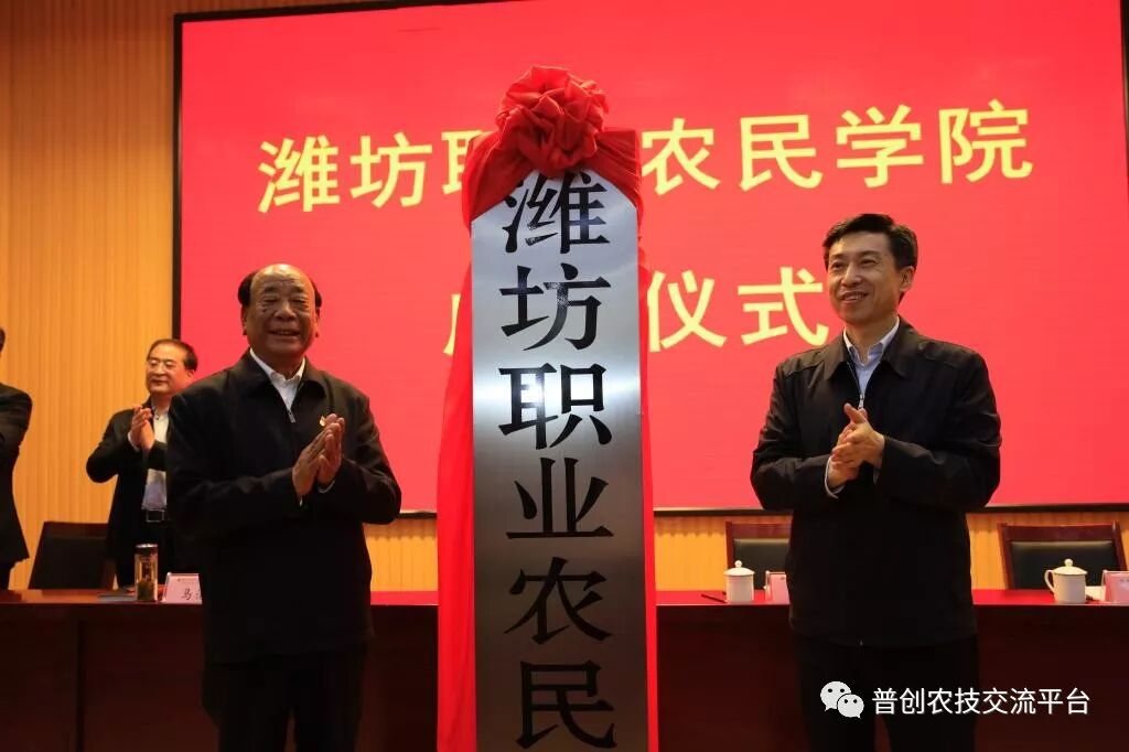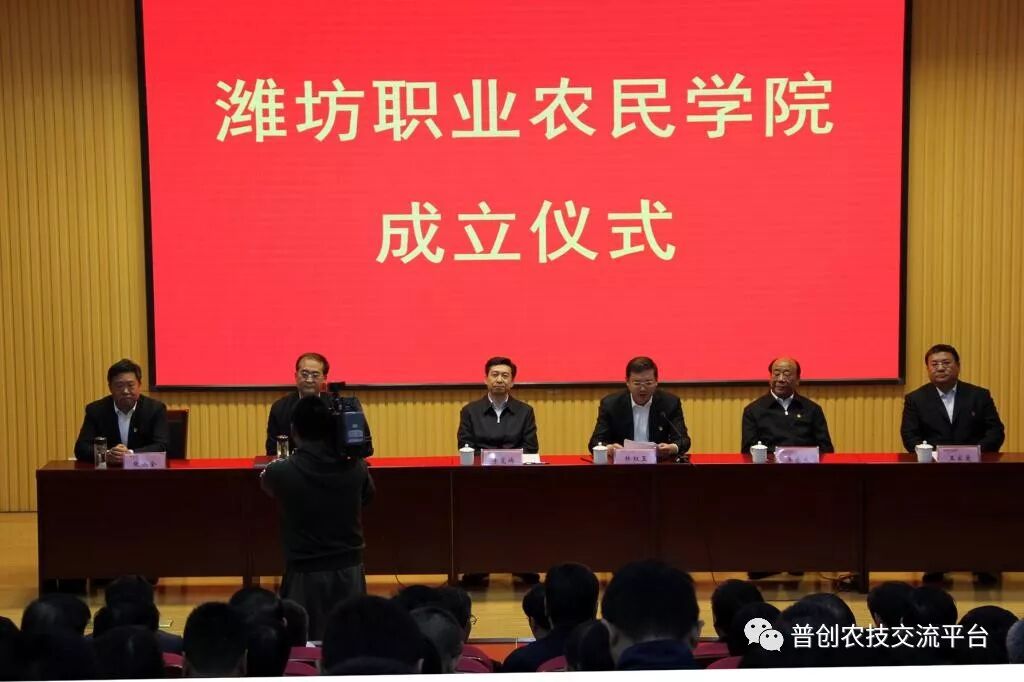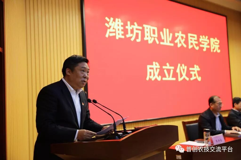 (开幕仪式) 4月16日上午,潍坊职业农民学院成立仪式在学院奎文校区隆重举行。 (潍坊职业农民学院揭牌仪式) 潍坊市委副书记、市长李宽端出席仪式并与党的十九大代表、寿光市三元朱村党支部书记王乐义一起为潍坊职业农民学院揭牌。 市委常委、组织部部长林红玉主持仪式,副市长马清民讲话,学院党委书记张洪全、院长王家爱出席,市直相关部门、学院领导以及部分涉农企业、兄弟院校主要负责同志,我院中层干部及师生代表140余人参加仪式。 (市委常委、组织部部长 林红玉) 林红玉在主持讲话中指出,组建成立潍坊职业农民学院,是市委、市政府全面贯彻落实习近平新时代中国特色社会主义思想和党的十九大精神,大力实施乡村振兴战略的重要举措,对培养新型职业农民,推动农业全面升级农村全面进步、加快“四个城市”建设具有重要意义。市委、市政府高度重视,刘曙光书记、李宽端市长都对成立潍坊职业农民学院作出重要指示,提出明确要求。他要求,市直各相关部门要充分发挥职能作用,全力支持配合学院的建设和教学工作,确保学院尽快步入正轨,实现高质量发展,为全面落实党的十九大精神、实施乡村振兴战略、推进“四个城市”建设贡献力量。 (副市长马清民)