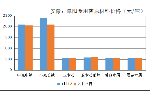 截止到2月15日,安徽阜阳地区上涨的食用菌原材料有2种,玉米芯由560元/吨涨至580元/吨,涨幅为3.6%;玉米芯压块由600元/吨涨至620元/吨,涨幅为3.3%;截止到2月15日,该地区下降的食用菌原材料有3种,中壳中绒由2100元/吨降至2060元/吨,降幅为1.9%;小壳长绒由2400元/吨降至2100元/吨,降幅为12.5%;香菇木屑由560元/吨降至550元/吨,降幅为1.8%;硬杂木屑价格趋于稳定,没有明显波动。