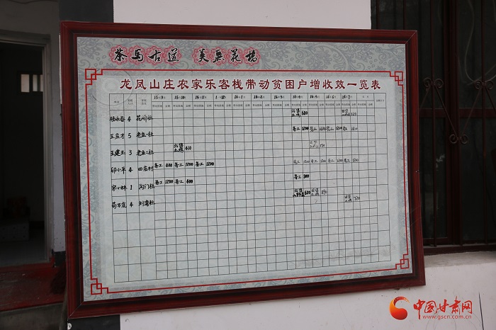 自己富了,也要带动同村村民一起富起来,卯张辉的农家乐楼下挂着一块醒目的牌子,上面写着“龙凤山庄农家乐客栈带动贫困户增收一览表”,清楚地记录着每一个在卯张辉的农家乐打工的贫困户分工、工资、提成。